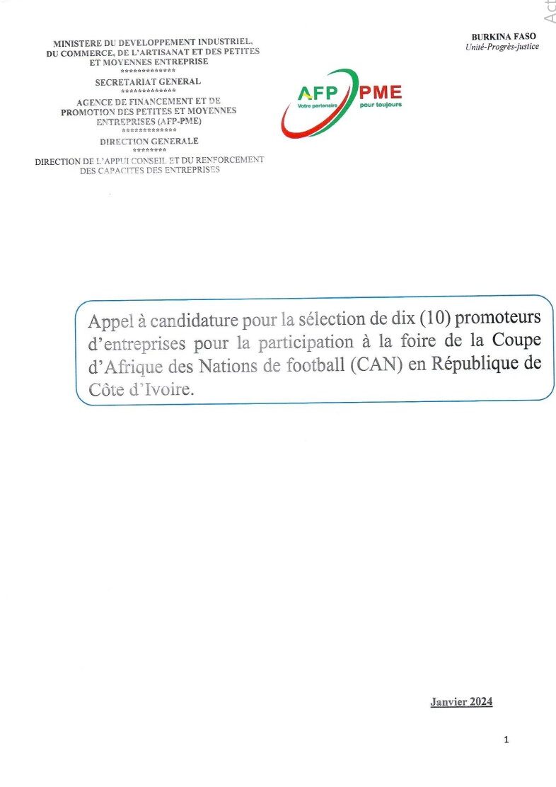 Dans le cadre de la participation des Etalons ร la 34e รฉdition de la Coupe dโAfrique des Nations de football, le MDICAPME entend promouvoir et valoriser les produits made in Burkina ร travers lโinitiative ยซ Village CAN ยป qui se tiendra ร Bouakรฉ. A cet effet, lโAgence de Financement et de Promotion des Petites et Moyennes Entreprises (AFP-PME), lance un appel ร candidature pour sรฉlectionner dix (10) PME pour exposer leurs produits made in Burkina ร ce ยซ Village CAN ยป. Lโexposition aura lieu du 13 janvier au 11 fรฉvrier 2024 en Rรฉpublique de Cรดte dโIvoire.
