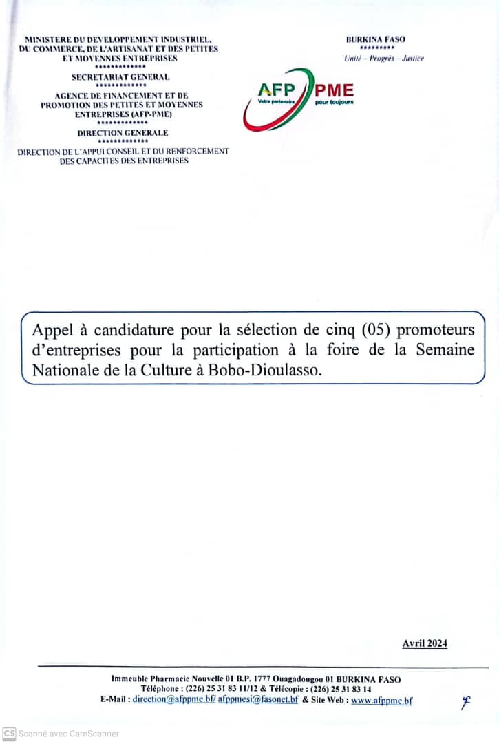 LโAgence de Financement et de Promotion des Petites et Moyennes Entreprises (AFP-PME) porte ร la connaissance des PME quโร lโoccasion de la 21e รฉdition de la Semaine Nationale de la Culture, elle lance un appel ร candidature pour sรฉlectionner cinq (05) PME pour leur participation ร la foire artisanale qui se tiendra du 27 avril au 04 mai 2024 ร Bobo-Dioulasso.