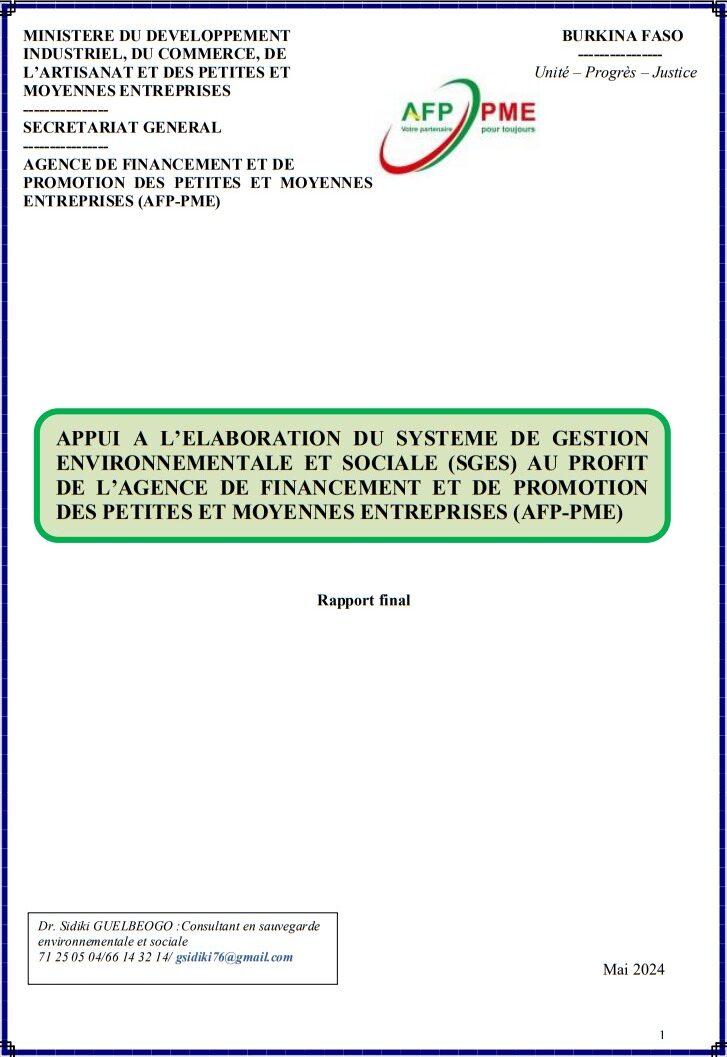 Le présent document constitue le Système de Gestion Environnementale et Sociale (SGES) de l’Agence de Financement et de Promotion des Petites et Moyennes Entreprises (AFP-PME). Il expose la politique ainsi que l’ensemble des procédures environnementales et sociales à appliquer aux activités financées par l’Agence. Ce système est instauré pour assurer la durabilité environnementale et sociale des activités de l’AFP-PME ainsi que des sous-projets des PME financés par l’Agence et ses partenaires techniques et financiers (PTF).