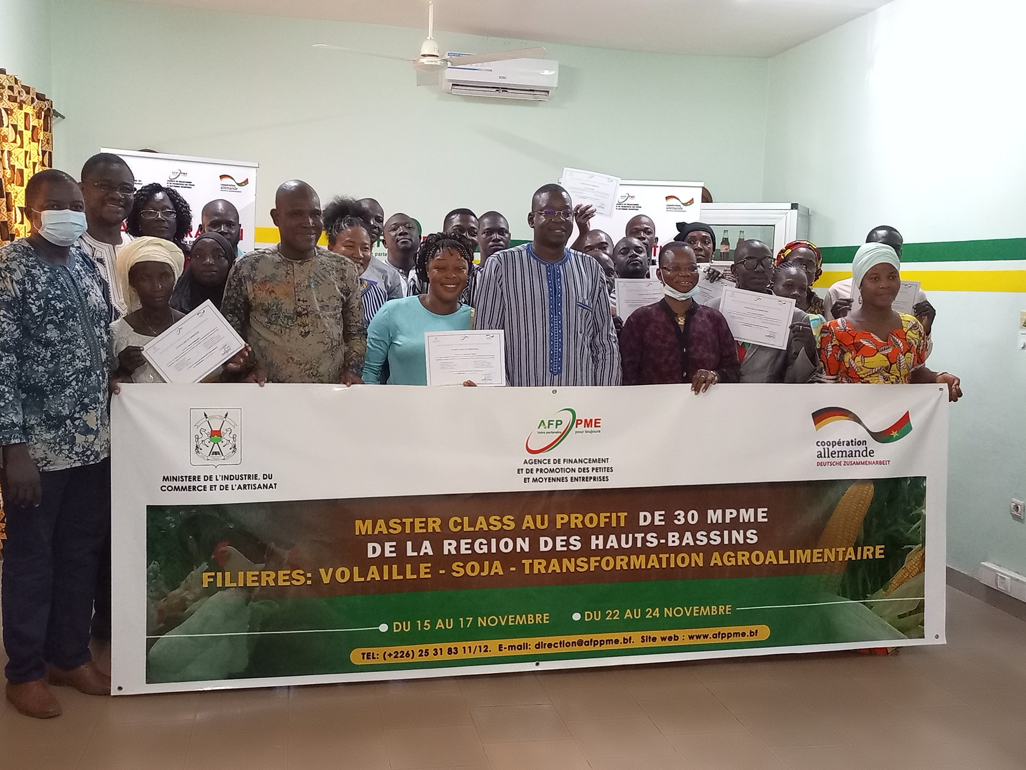 L’Agence de Financement et de Promotion des Petites et Moyennes Entreprises (AFP-PME) a organisé deux sessions de formation du 15 au 17 et du 22 au 25 novembre 2021, à Bobo-Dioulasso au profit de 30 Micros, Petites et Moyennes Entreprises (MPME) de la région des Haut-Bassins évoluant dans les secteurs de l’aviculture, le soja et la transformation agro-alimentaire.